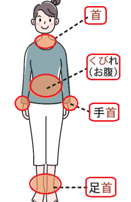 首・手首・足首・腰首(お腹) は、太い動脈が体の表面近くを通っているので冷えやすく、冷めると体全体まで冷やしてしまうからです。.