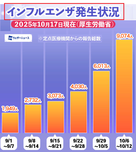 直近1週間の定点医療機関からの報告数は「9,074人」で、前週より3,000人ほど増加し、9,000人を超えるのは昨年より約1か月早いペースだそうです。.