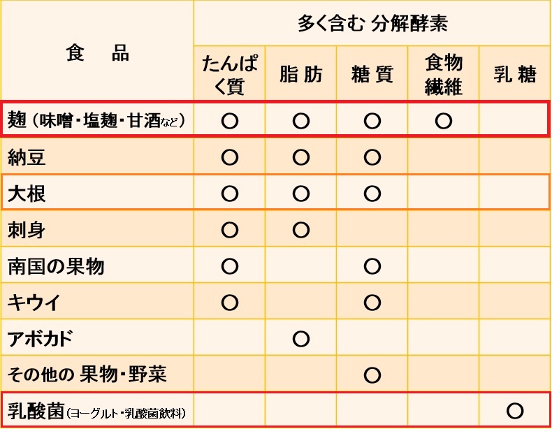 非加熱の食材(発酵食品・生野菜・果物・刺身)の中で、特に消化を助ける力が強い食材を上の表に列記しました。