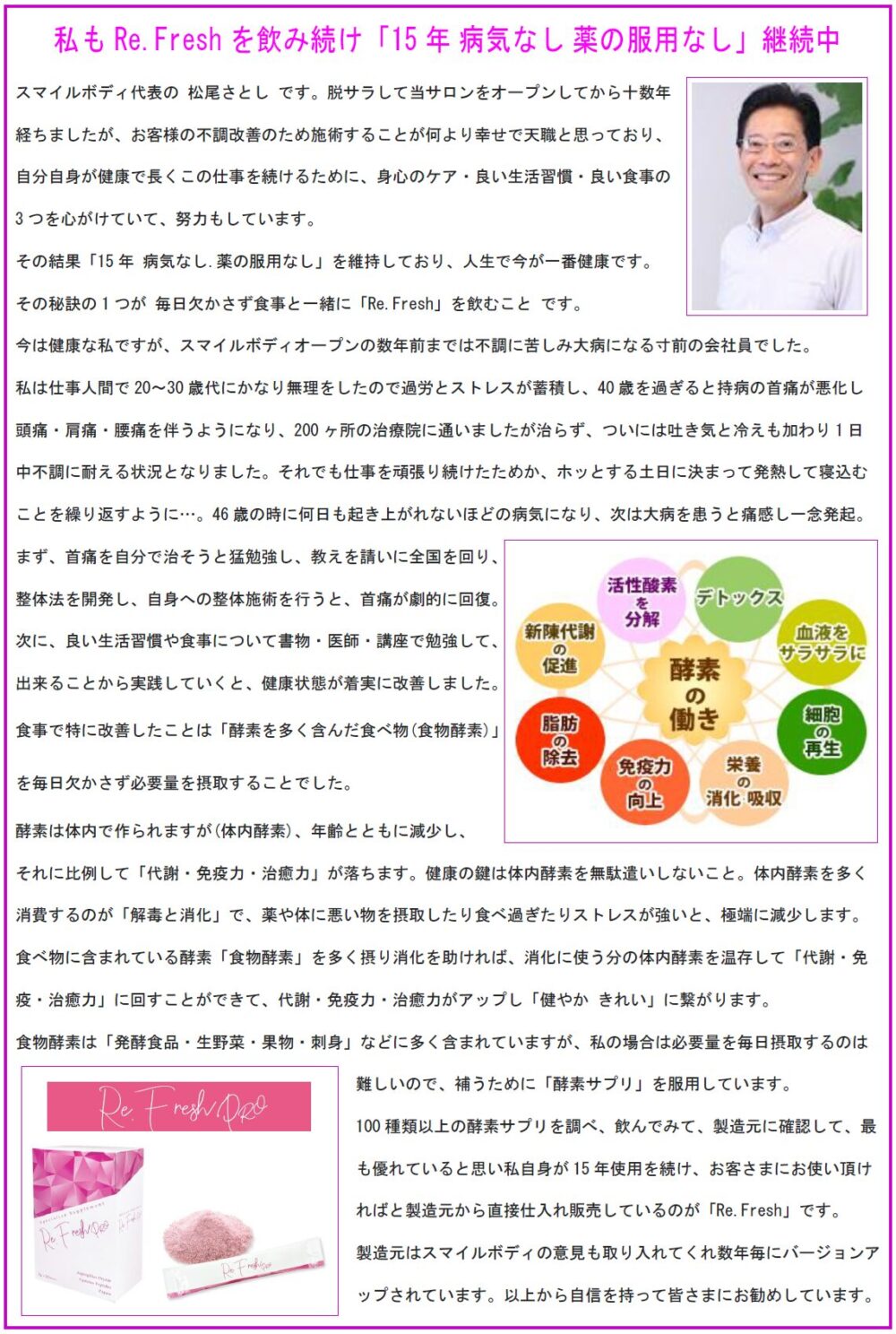 100種類以上の酵素サプリを調べ、飲んでみて、製造元に確認して、最も優れていると思い、私自身が15年使用を続けいるのがRe.Freshです。